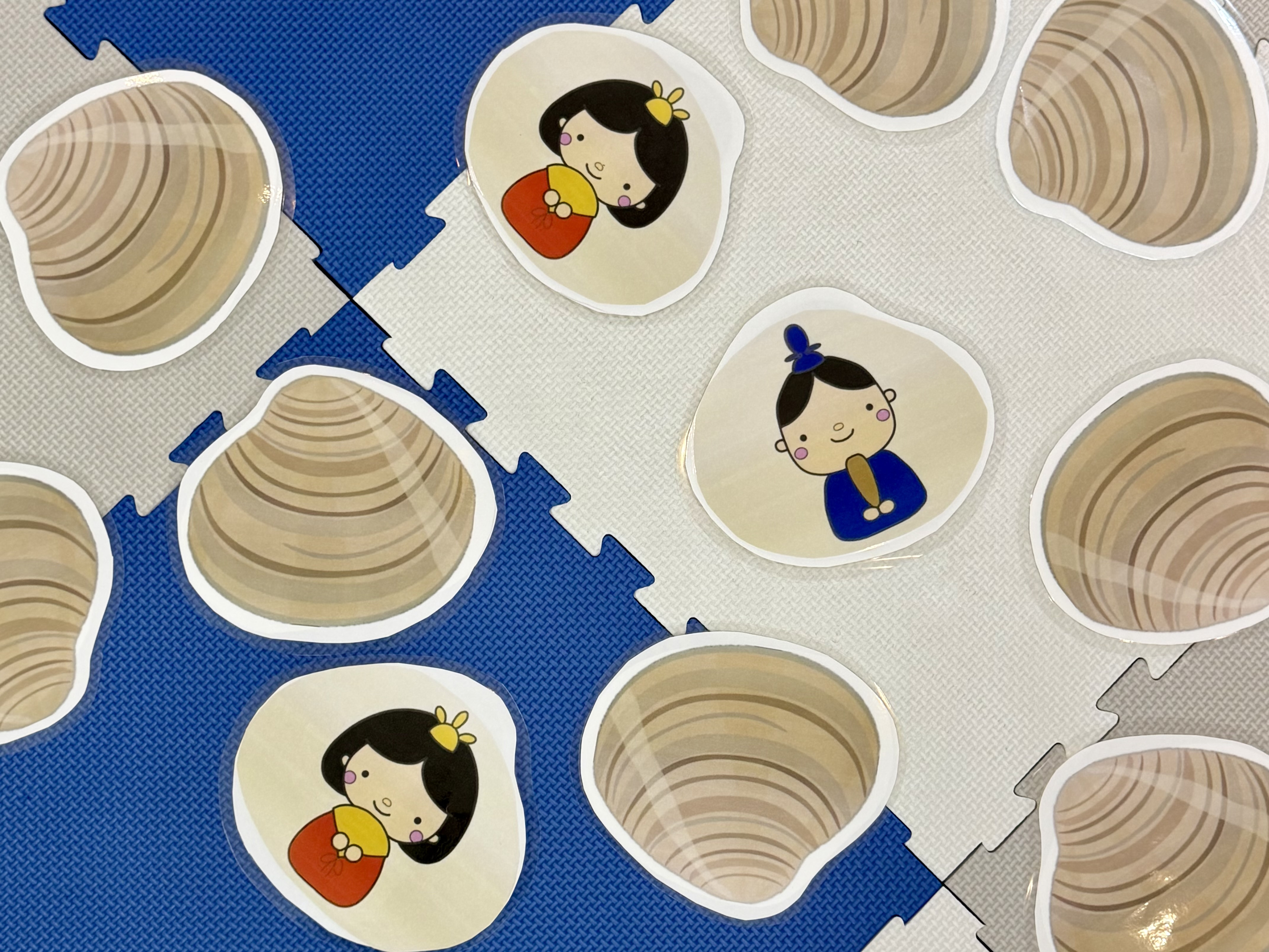 ハマグリの絵柄の裏面には、活動に少しでも興味をもてるように、子どもたちの好きなキャラクターなどの絵柄になっています。神経衰弱のように、同じ絵柄をめくれればカードをゲットできます。