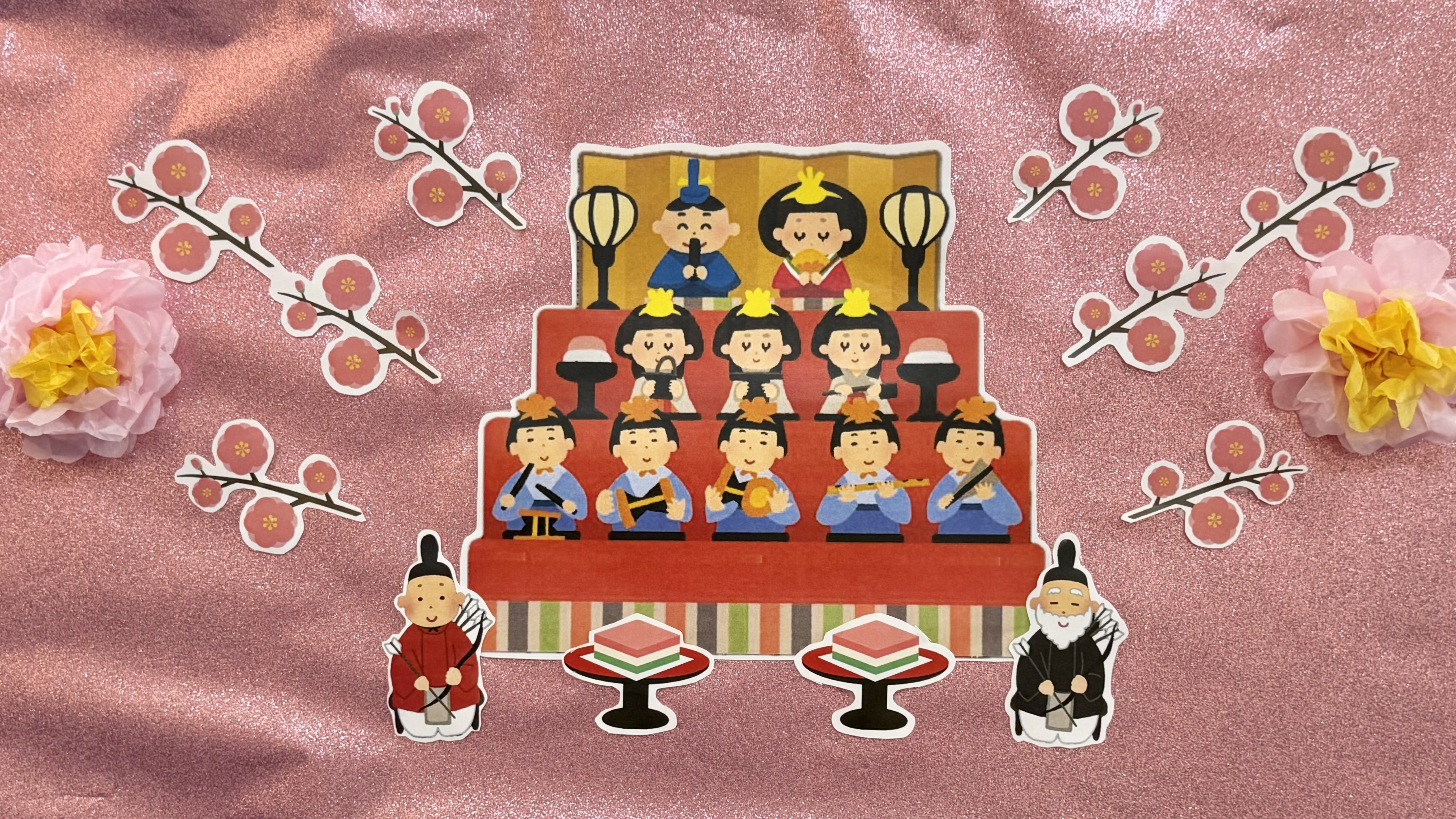 そして「うれしいひなまつり」の歌の動画を視聴しながら「コレがぼんぼりだよ~」「ピンクの花は桃の花なんだよ~」など、子どもたちに歌詞の意味を説明しました。